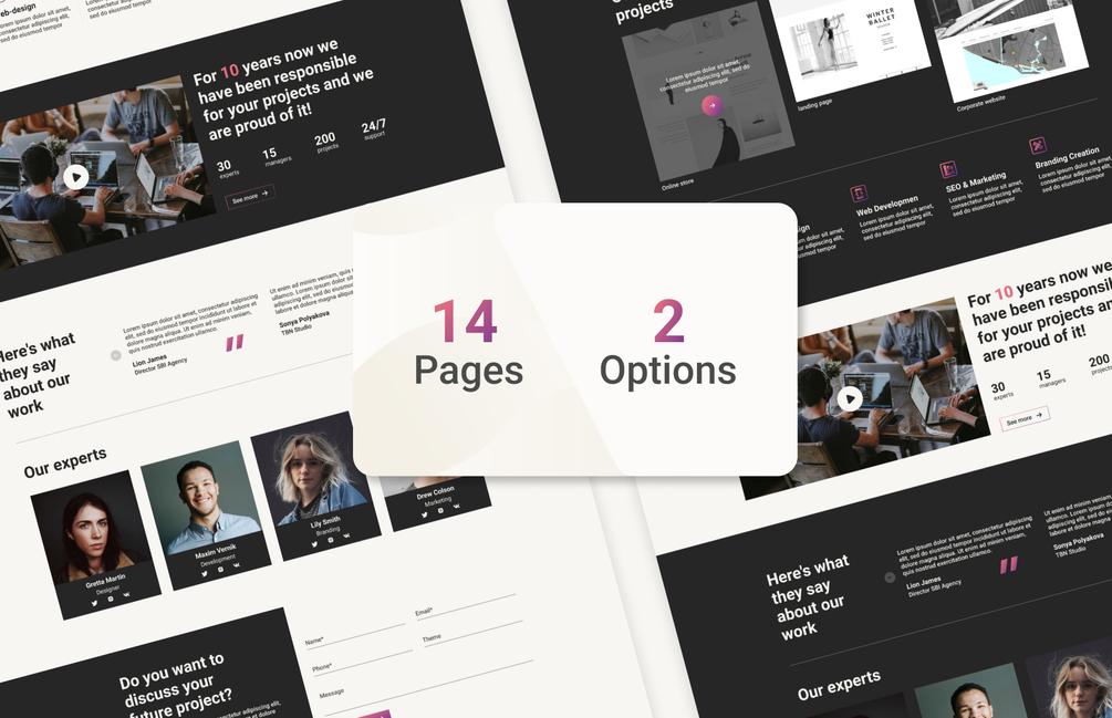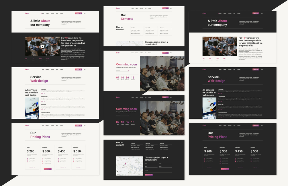 Éxito – is a modern Figma template for all kinds of web studios and websites. The template is great for agency, start-up, business and portfolio websites. It consists of 14 well-organized Artboard components. Has 2 types of themes: white and dark. All elements are easy to edit. My template contains all the most necessary pages for this direction.