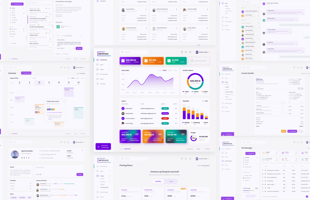 Infopack-a professional, modern dashboard user interface kit that can cover various administrative jobs such as company administrator, project administrator, email dashboard, invoice dashboard, product dashboard, calendar dashboard and other site administrator dashboard.
